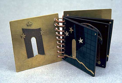 2 x 2-1/2 x 1-1/2 inches closed. Brass, formica, found objects, fabricated. The rusty shape on the top of the arch was found on the street. Whatever it is, I couldn't drill through it, so it's held down by the three riveted stars. The decorative scroll is acid etched, and the ground line was cut with a jeweler's saw |