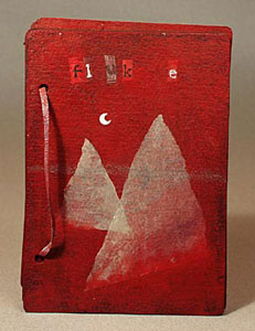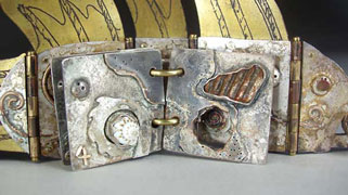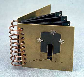 2-1/4 x 5-1/2 x 1 inch. Brass, sterling silver, gold solder, pearl, copper, shells, coral, star fish. Fabricated. The design on the tail and fins was acid etched. I used gold solder to "color" the silver pages and body. It's hard to control, but you can just let the solder flow over the metal. Sometimes it flows nicely into etched lines. You can also try to push it around with a soldering pick. This book was featured in Shereen LaPlantz's 'Cover to Cover.' |