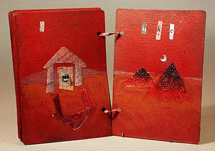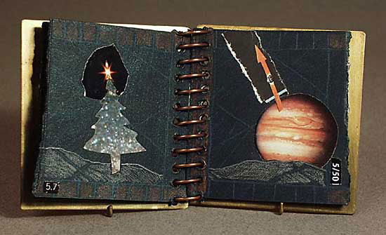 7 x 5 x 1 inch closed. Collage on watercolor paper painted with acrylics. The title was inspired by an article in the newspaper titled '"Universe may have been fluke' The text of the article title is 'hidden' in the collages. Since I didn't know anything about book binding I just tied the pages together with a painted gros-grain ribbon. |