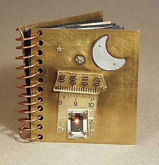 3 x 5-5/8 x 5/8 inches (open) Cover: brass, plastics, found objects, fabricated Pages: collaged watercolor paper A photo of this book was in Shereen LaPlantz's 'Cover to Cover' |