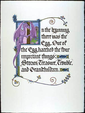 The Dragon's Egg by Melissa Dinwiddie (California, USA) The text is by Philip Heller Hand-lettered with steel pens and stick ink, illuminated with 24kt gold leaf, watercolor and gouache.