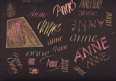 Anne A 'play sheet' for Cyberscribe Anne Cheney Materials: Mica powder paint through a pointed pen next Karen's Gallery Entrance Calligraphy Galleries Cecilia's Home Page