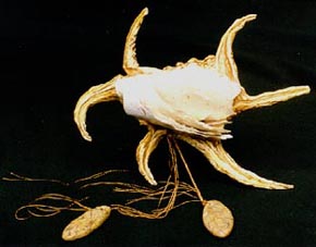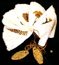 Materials: Spider shell, stone beads, copper thread, Japanese handmade paper, pressed Australian flowers and leaves next