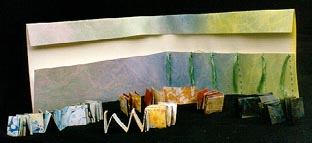 Materials: Pasted Arches 300 gsm Aquarelle, various marbled papers, embroidery thread, Australian budgerigar feathers and gum nuts next