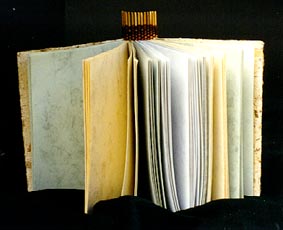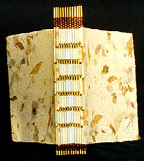 Materials: Thai Banana Leaf paper, 'marbled' stock, Arches Aquarelle 300 gsm, bamboo skewers, Caron hand-painted cotton thread.