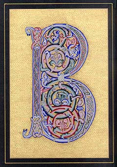 Illuminated 'B' Approximately A4 size Gouache and Sakura gold on Canson Mi Teintes next Shelley's Gallery Entrance Calligraphy Galleries Cecilia's Home Page