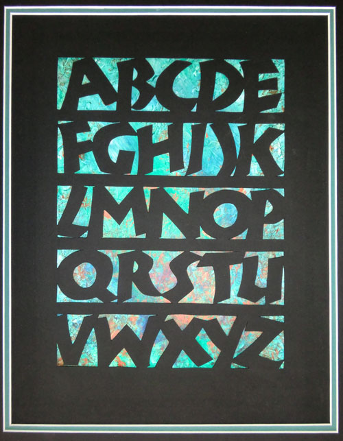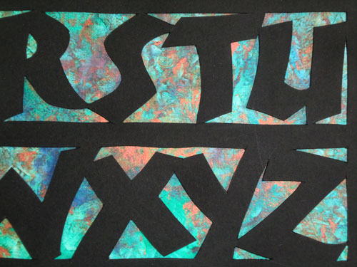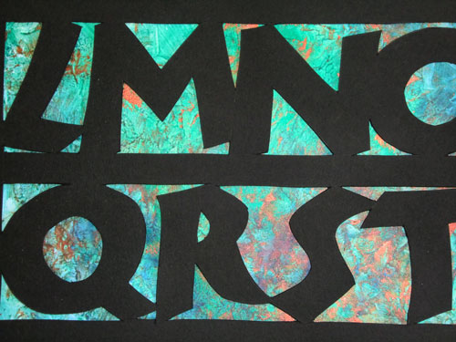 Neuland alphabet. Paper cut out. Hand dyed paper background